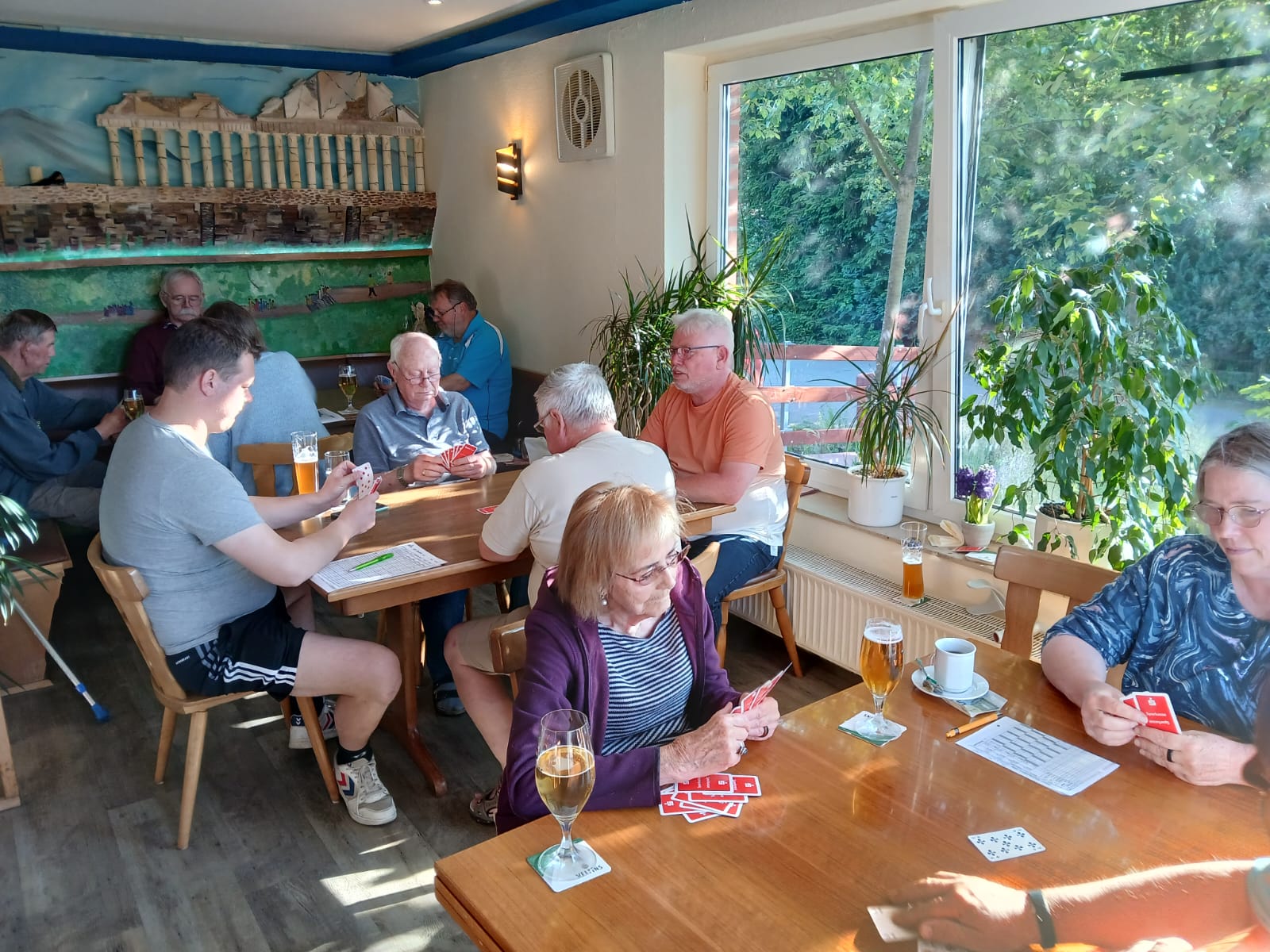 Wir sind zur Zeit 14 Spieler/innen im Alter zwischen 28 und 92 Jahren. Wir machen einen Sommerpreisskat und einen Winterpreisskat.